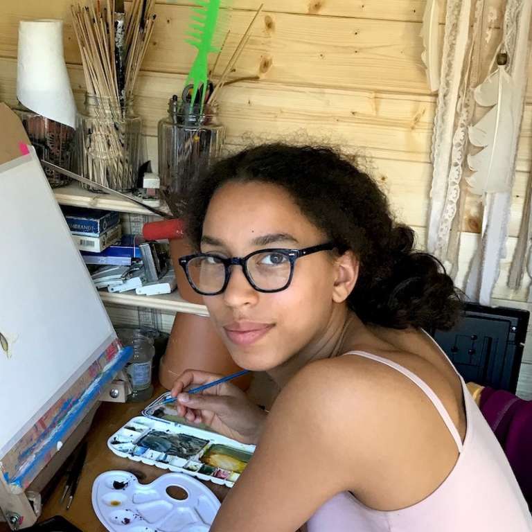 From her studio in Tottenham, Chisara explores many cultures and faiths, drawing on our shared experience of spirituality and also her own connection to the natural world to create work. Working in watercolour and colour pencil and oil paints, Abstracted leaves, fungi, and flowers are often present in her paintings and she feels an acute connection to nature, its geometry and the cycle of the seasons.