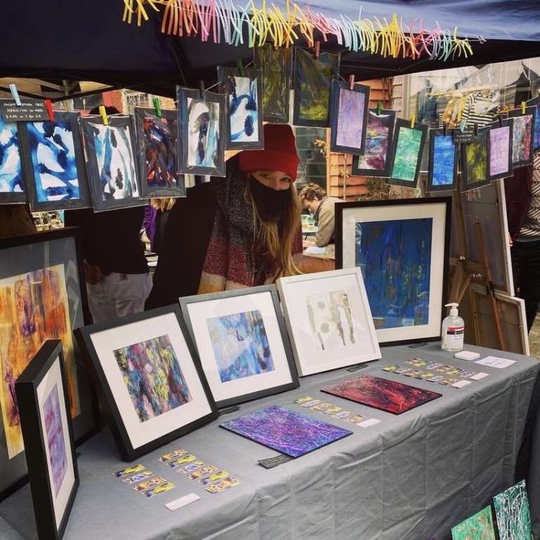 Esther is a self-taught painter who lives in Tottenham and has a studio based in Wood Green. She works in oil and acrylic and plays with colour and texture to convey atmosphere. Her brightly coloured works use the fluidity of paint and water alongside a range of mark making to create varied abstractions. She combines her work as an artist with community work, particularly focused on women’s rights.
