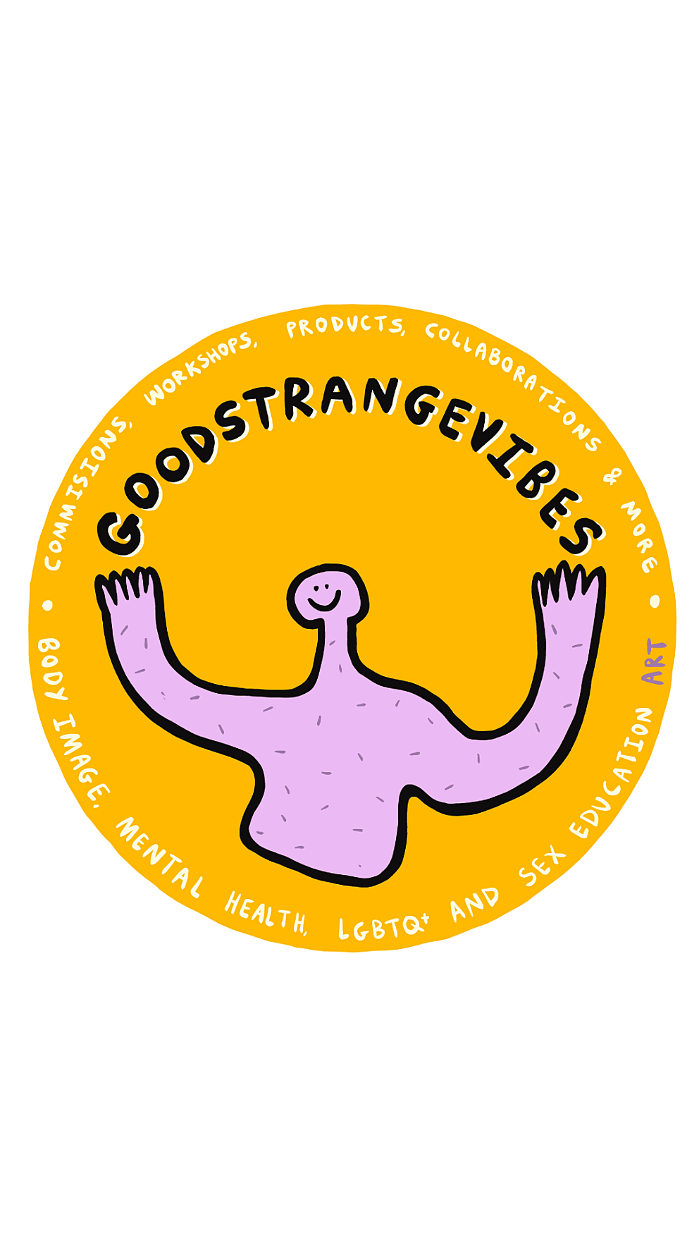 Hello, I’m Lou, a non-binary artist. I set up my small business Goodstrangevibes in 2017 to use art to make a difference in relation to mental health, body image, LGBTQ+ topics and sex education. My artwork is informed by my queer identity, mental health experiences, academic insights (degree in Politics, Psychology & Sociology) and desire for change (the status quo clearly needs challenging!). Goodstrangevibes primarily involves running creative mental health workshops, commissions, sharing my art on social media (@goodstrangevibes) and selling my art on products (goodstrangevibes.com/shop). Products include: zines, badges, tops, notebooks, stickers, postcards, greeting cards, posters and original art. Climate and ethics are super important to me, transparent updates are on my website. I'd love to hear from you (goodstrangevibes@gmail.com) if you have any questions or would like to hire me for a commission or workshop.