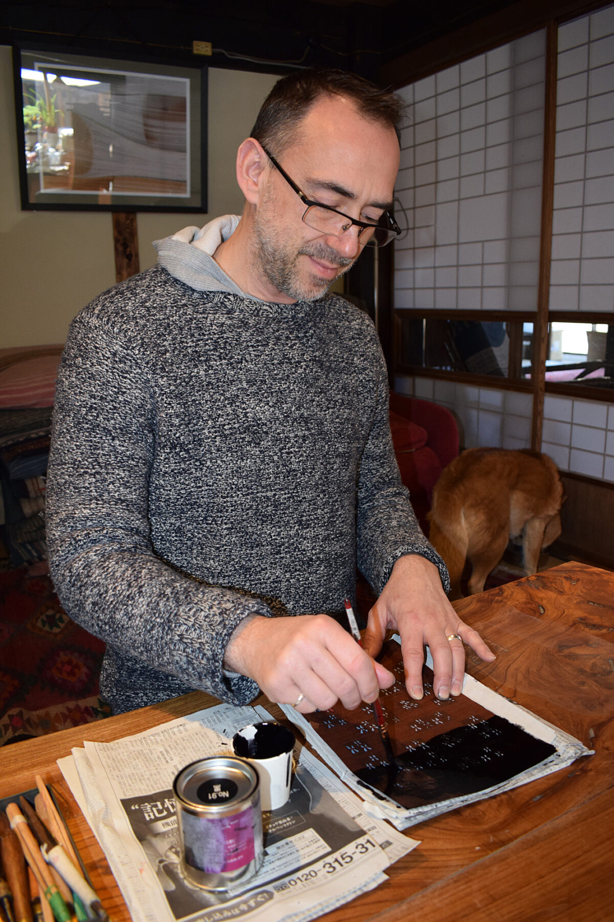 I originally learned Shibori at West Dean College in 2011 and then, following further Shibori courses as West Dean, went to study with indigo guru, Bryan Whitehead, in Japan in 2014. I returned to Japan in 2018 and 2019 to expand my Shibori and Katagami skills with Bryan.